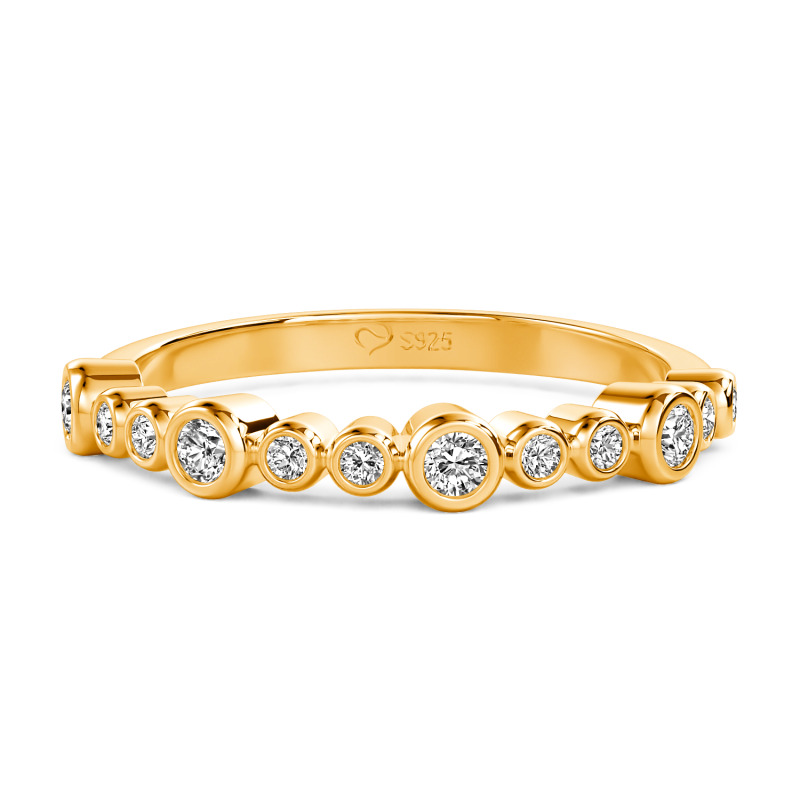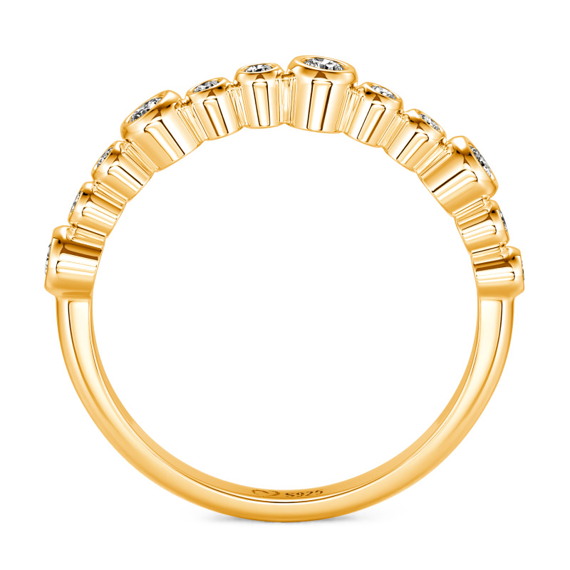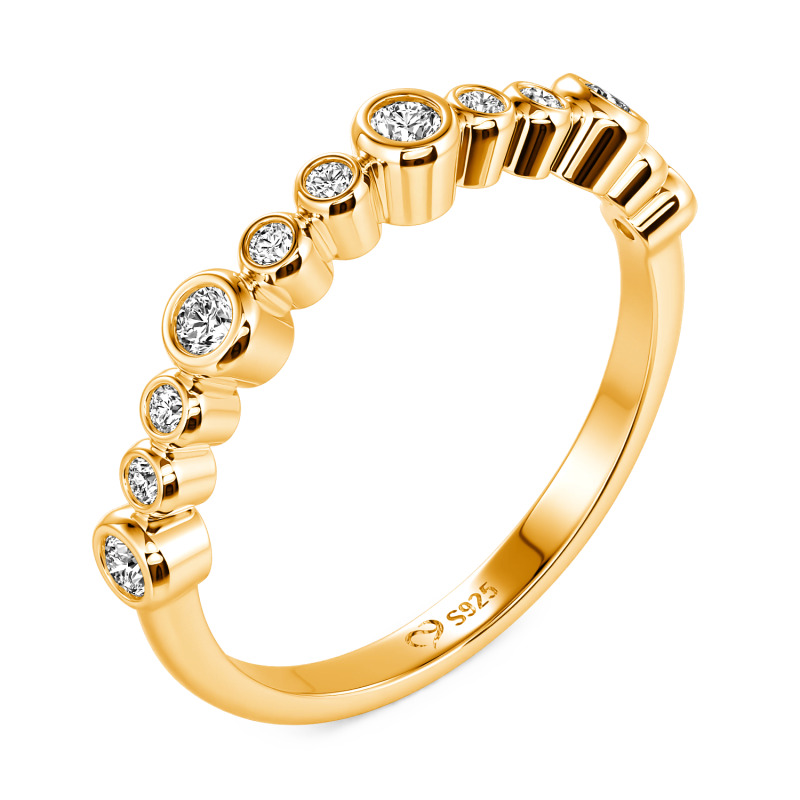 Este anillo apilable Jeulia Everyday presenta piedras redondas dispuestas de forma escalonada y artística, creando una joya versátil para superponer sin esfuerzo. Su banda ultrafina garantiza comodidad incluso al llevar varios anillos, mientras que el baño de oro recibe un tratamiento especial antideslustre para mantener un brillo duradero. Combina este delicado anillo con una camisa blanca impecable por la mañana para captar la luz con un resplandor translúcido. Apila tres anillos para una tarde de arte deslumbrante en los dedos. Lleva uno solo por la noche, descansando este anillo diario en tu nudillo para revelar sus exquisitos detalles.