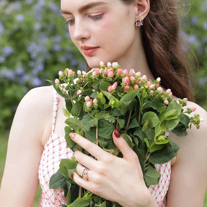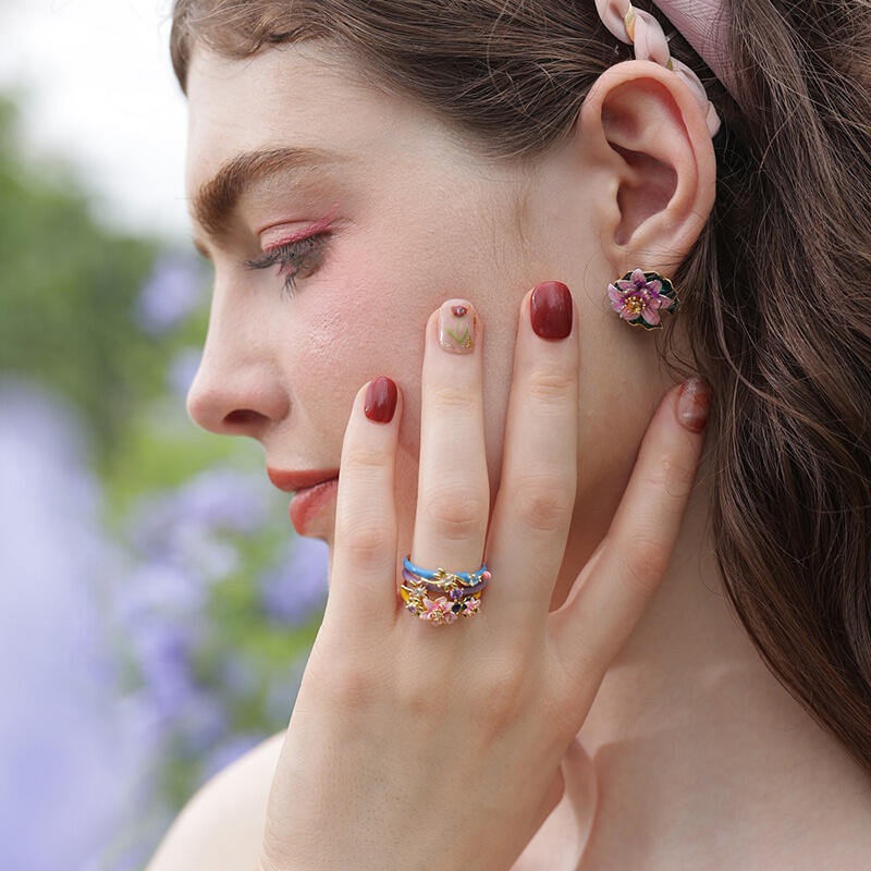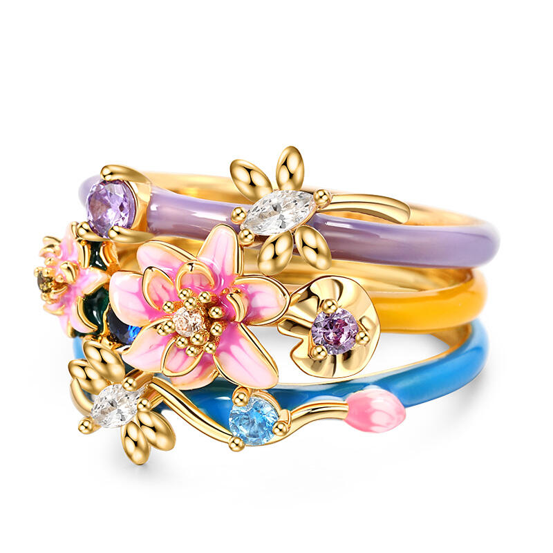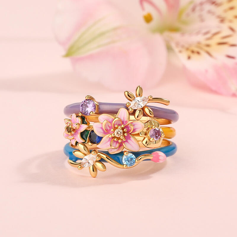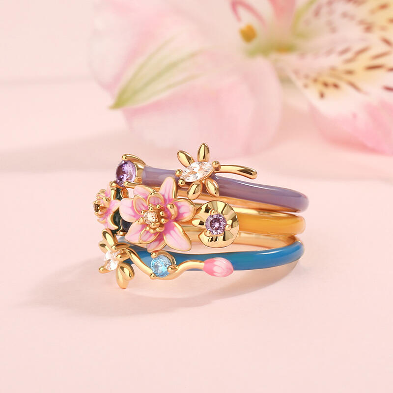 No hay nada más coleccionable que este precioso anillo apilable. Transformando el icónico "Nenúfares" de Monet en un inesperado y artístico tesoro, este anillo apilable bellamente detallado ostenta encantadores lotos en brillantes tonos de esmalte y libélulas. En el cuadro de los nenúfares de Monet, las libélulas no son visibles. La libélula es la imaginación del diseñador sobre el estanque de nenúfares de Monet. Este anillo apilable muestra el onírico juego de luces y sombras sobre la brillante superficie del agua.