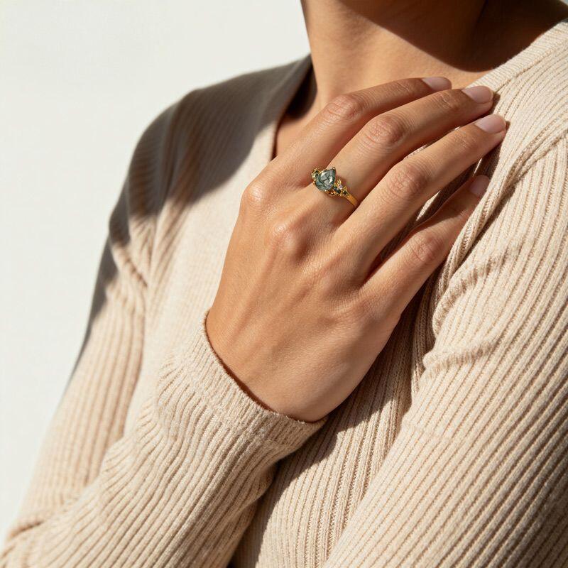 Eleva tu momento especial con el anillo de compromiso ágata musgo corte pera hoja de acebo oro Jeulia. En su centro destaca una llamativa ágata musgo corte pera, cuyas venas orgánicas le confieren un encanto natural y distintivo. Intricados accentes de hoja de acebo, adornados con piedras de acento verdes y transparentes, enmarcan magníficamente la gema principal y realzan su atractivo inspirado en la naturaleza. Montado en un anillo de oro cálido, ofrece un contraste lujoso con los tonos apagados de la ágata musgo, equilibrando textura orgánica y delicados detalles festivos.