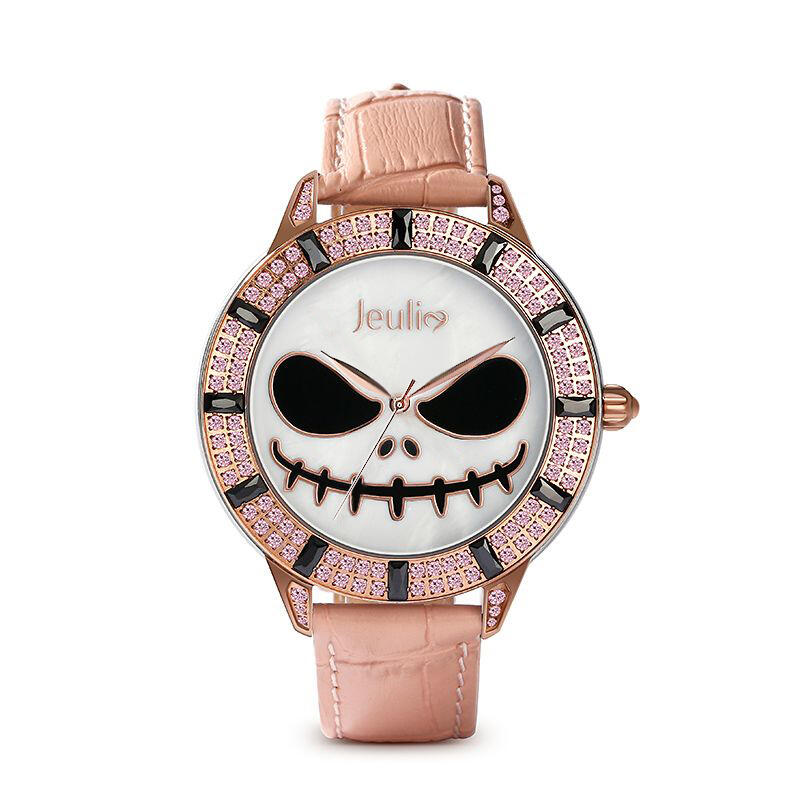 Jeulia "Master of Fright" Reloj De Cuarzo Con Correa De Cuero Negro Y Diseño De Calavera Con Esfera De Nácar