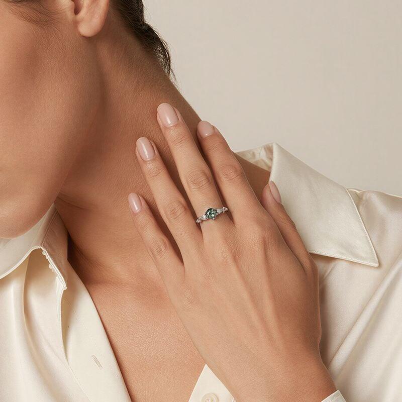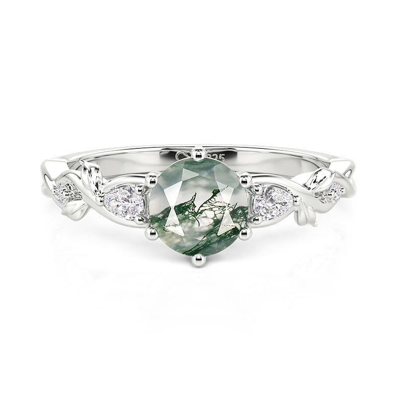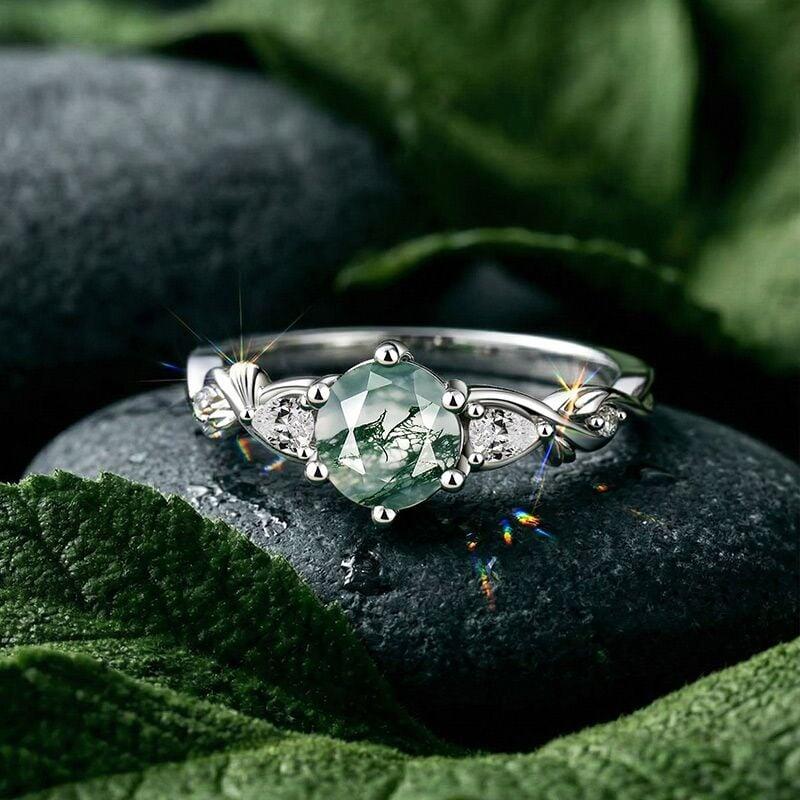 Este etéreo anillo de ágata musgosa inspirado en la naturaleza de Jeulia captura la tranquilla belleza de la naturaleza, con una luminosa ágata musgosa de corte redondo en su centro con delicadas inclusiones parecidas a helechos. La banda elegante se tuerce en graciosos motivos de hojas y enredaderas, realzados por diminutas piedras pavé que capturan la luz como gotas de rocío sobre la vegetación. Elaborado en plata esterlina pulida, el diseño fluido envuelve el dedo con elegancia orgánica — ligero para el uso diario, pero perfecto para compromisos, aniversarios o como recuerdo inspirado en la naturaleza.