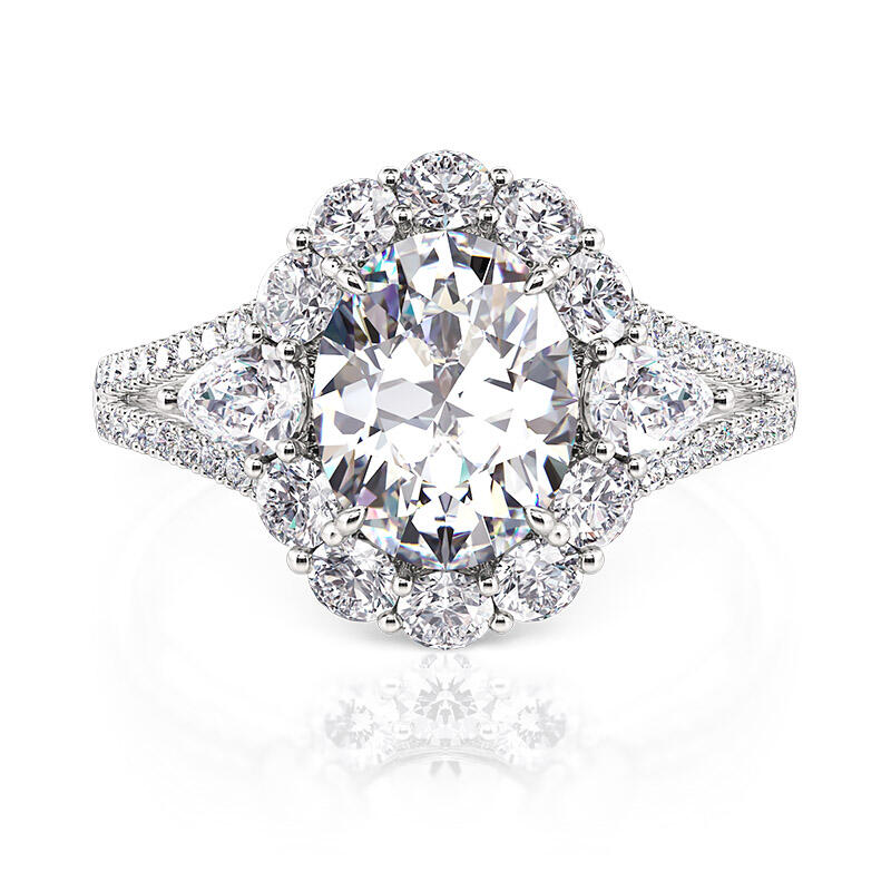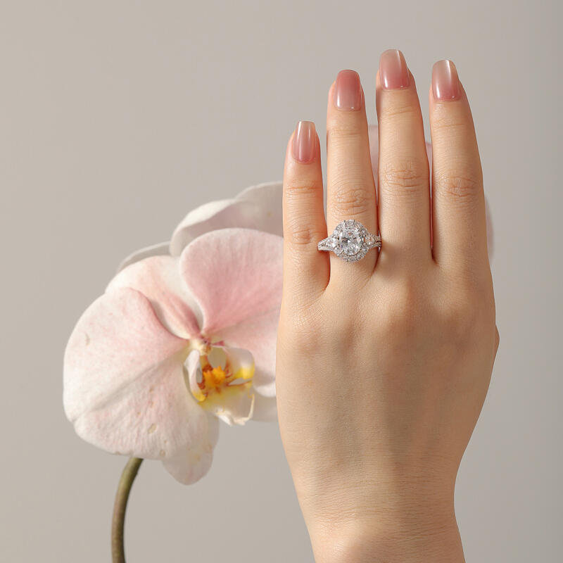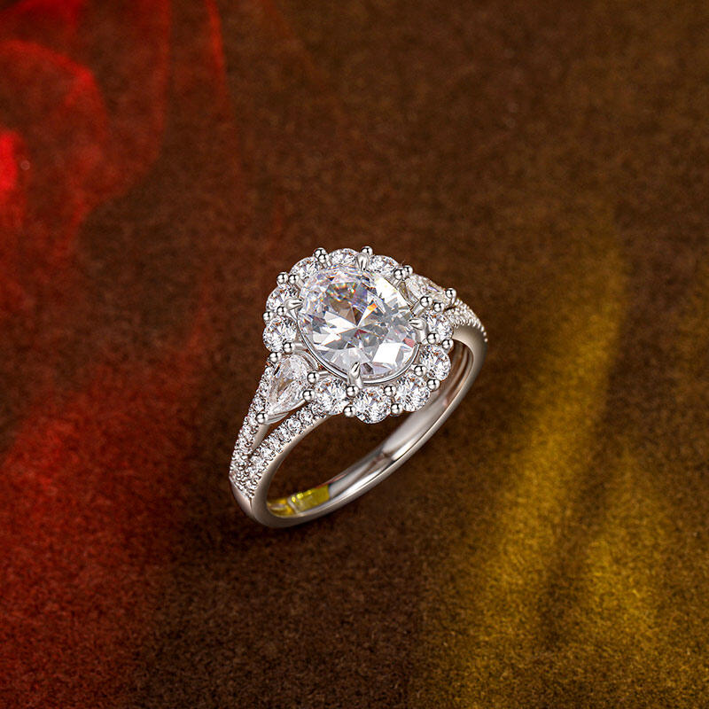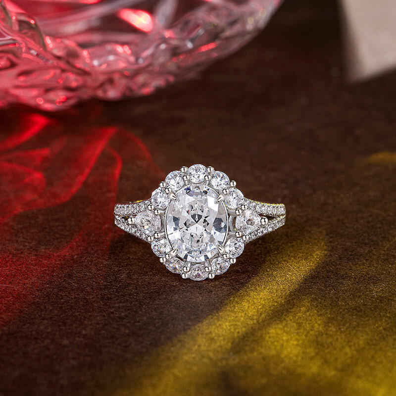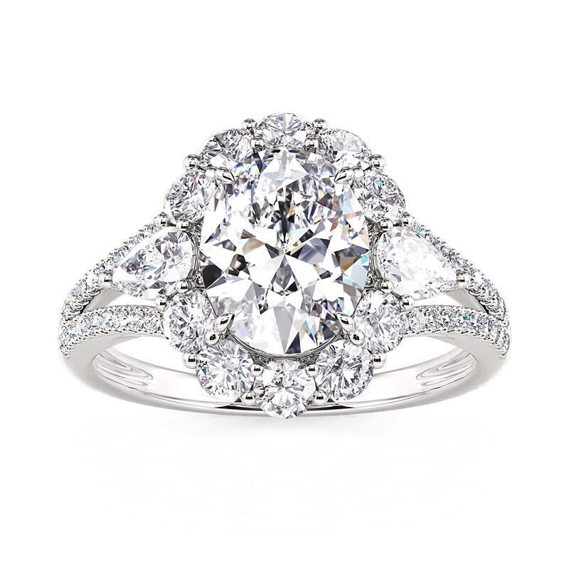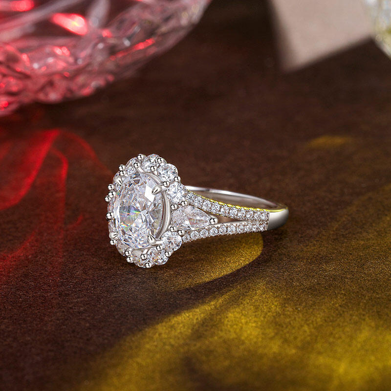 Este anillo de compromiso vintage de halo con tres piedras es hermoso y único por su diseño de halo especialmente formado que rodea perfectamente el diamante ovalado en el centro. Las piedras laterales en forma de pera en los lados izquierdo y derecho están salpicadas como elfos, añadiendo un toque de espíritu y elegancia, haciendo que toda la pieza esté llena de capas y detalles. Los brazos del anillo de compromiso de piedra central grande están engastados en pavé de doble hebra, y los diminutos diamantes centelleantes brillan a la luz, formando un halo brillante que se asemeja a una escena nocturna reflejada por el cielo estrellado. Este anillo de halo con piedra central grande no solo es lo último en artesanía y lujo, sino también una interpretación atemporal del amor, perfecto para conmemorar momentos importantes o expresar emociones profundas.